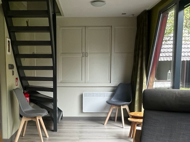 In het woongedeelte naast de trap die u naar de 1e verdieping brengt, bevindt zich rechts een bedstee met 1 persoons slaapplaats welke met schuifdeuren is af te sluiten.